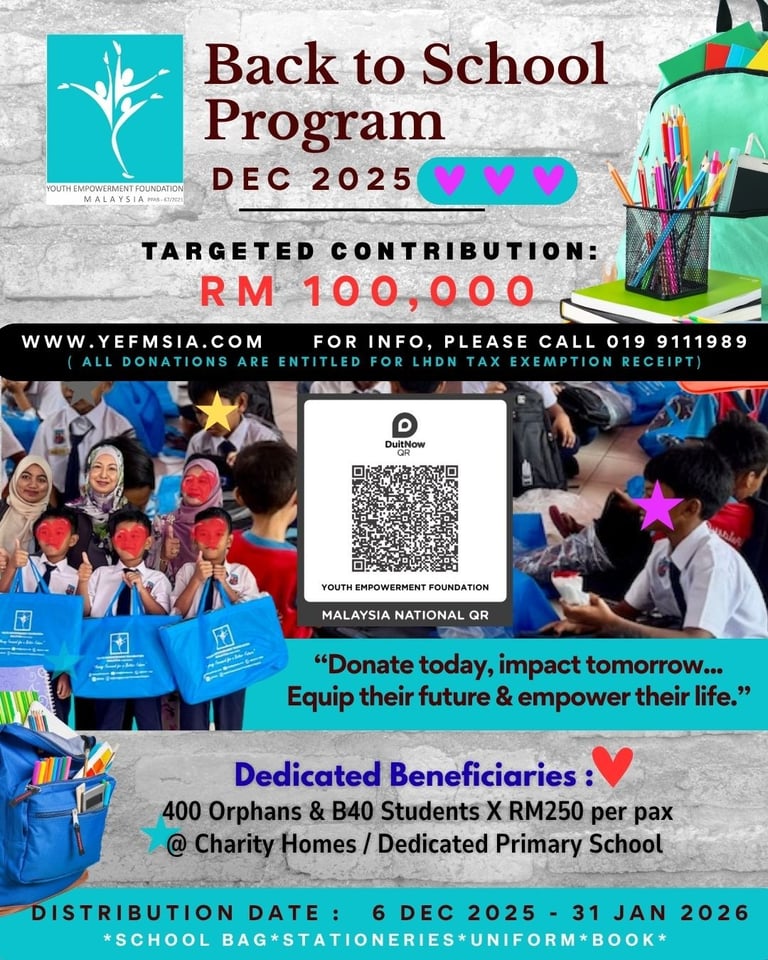 The distribution, scheduled from 6 December 2025 - 31 January 2026, presents a meaningful opportunity for corporate partners and donors to make a lasting difference in the lives of underprivileged youth across Malaysia. Through your generous contributions, this initiative will help equip students with essential school supplies, empowering them to pursue their education with confidence and hope for a brighter future.